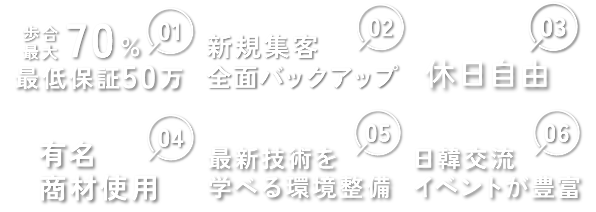 名駅の好立地にある、洗練された内装と充実した設備のサロン。ここでは本場・韓国の最新トレンドを学び、日本のお客様に合った形で提供することができます。AIによる売上や技術のデータ分析を通じて、自分の強みや課題を明確に把握。「何が足りないか?」が可視化されるから、着実なスキルアップにつながります。さらに、日韓合同の会社だからこそ、現地の情報をいち早くキャッチでき、 新しい技術やメニューにもいち早くチャレンジできる環境があります。実力ある仲間たちと互いの得意分野をシェアしながら、刺激を受け合い、常にアップデートしていける。 ここは、あなた自身が"進化"できるサロンです。